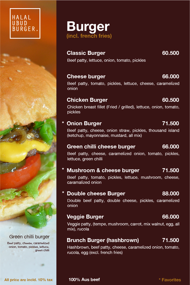 Welcome to Halal Ubud Burger, a delightful culinary spot nestled in Ubud, Bali. This Hawaiian-inspired restaurant specializes in gourmet halal burgers, making it a must-visit for food enthusiasts seeking quality and flavor. The menu features a concise yet enticing selection of burgers, each crafted with 100% halal ingredients.